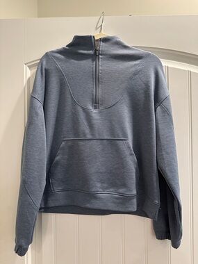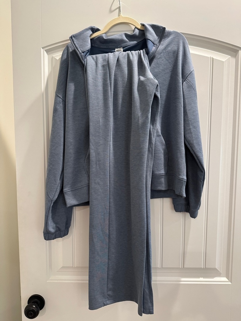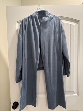 Soft slate blue hoodie with matching wide-leg pants. Casual, relaxed fit. Simple, versatile set for everyday wear.