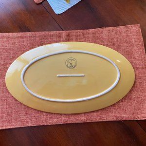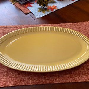 This beautiful Tuscan yellow ceramic tray is perfect for appetizers, cheeses & desserts! It's fairly shallow, see the third picture. Matching trivit has a cork covered bottom to protect table/counter. Both items are in absolutely perfect condition! This golden yellow color goes with almost everything - perfect for holiday entertaining! The 2nd pic & closeup of logo most accurately show the color. From a smoke free home, with quick & careful shipping.