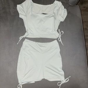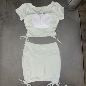 Super cute workout set. Lightly worn - like new. Top & bottom included. High waisted biker shorts. Matching short sleeve crop top with open back. Removable pads. Adjustable strings on both top and bottom. Color: mint green