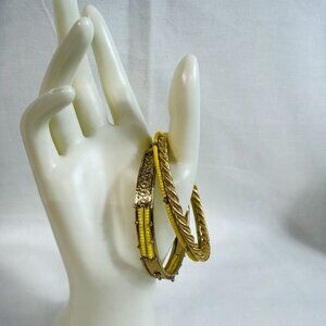 Set of 3 Gold Tone Bangle Bracelets with Yellow Seed Bead Accents – Textured & Twisted Designs