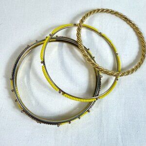 FEATURES: Set of three gold tone bangle bracelets featuring unique designs. One bracelet has a bold twisted rope style, one is accented with bright yellow seed beads and gold tone beads, and the third features intricate etched detailing with seed bead accents. Perfect for stacking or wearing individually.