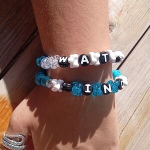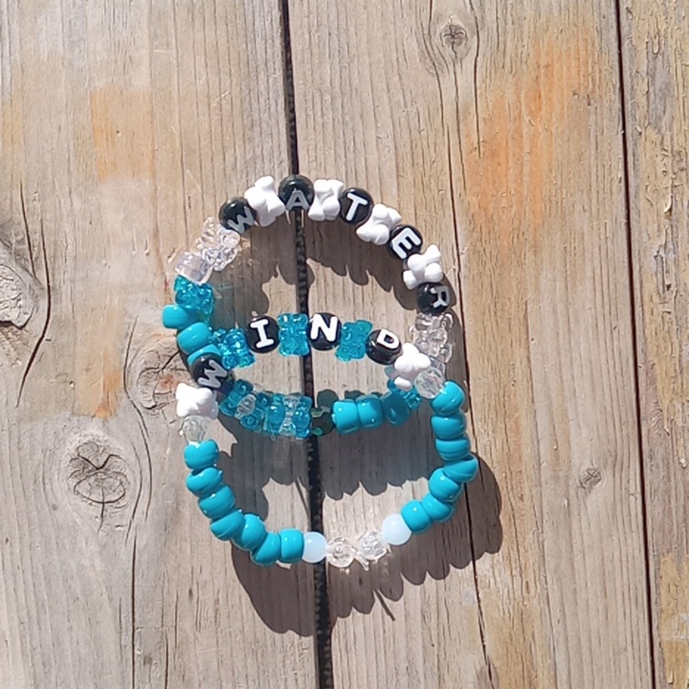 Made with stretch core and pony beads. Colors blue, light blue, clear, white and black.