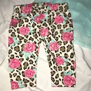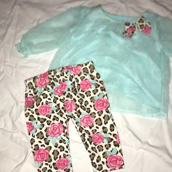 Floral animal print leggings and matching teal top with sheer sleeves.