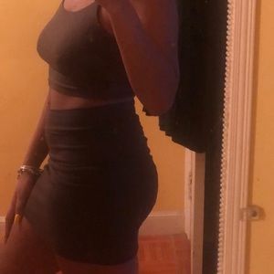 Green, spaghetti strap crop top, and skirt