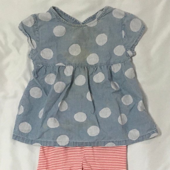 Denim shirt with polka dots and striped red/white leggings