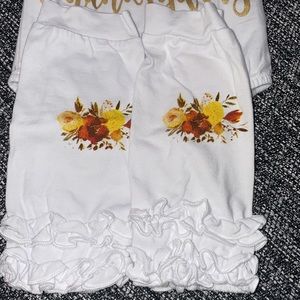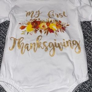 Matching set. Top is white long sleeve with ruffles on the shoulders. It says my first thanksgiving and has flowers in the middle. Also comes with stockings on the same fashion. Worn only once like brand new :)
