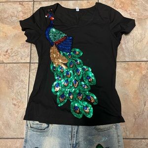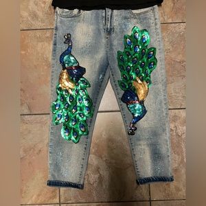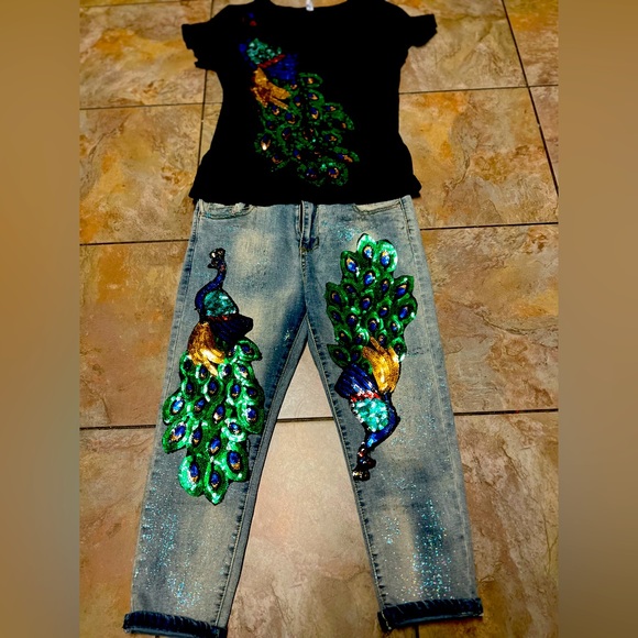 Matching pants set Embellished with sequin design Gently worn only once Jeans are size 29 Shirt is a size L