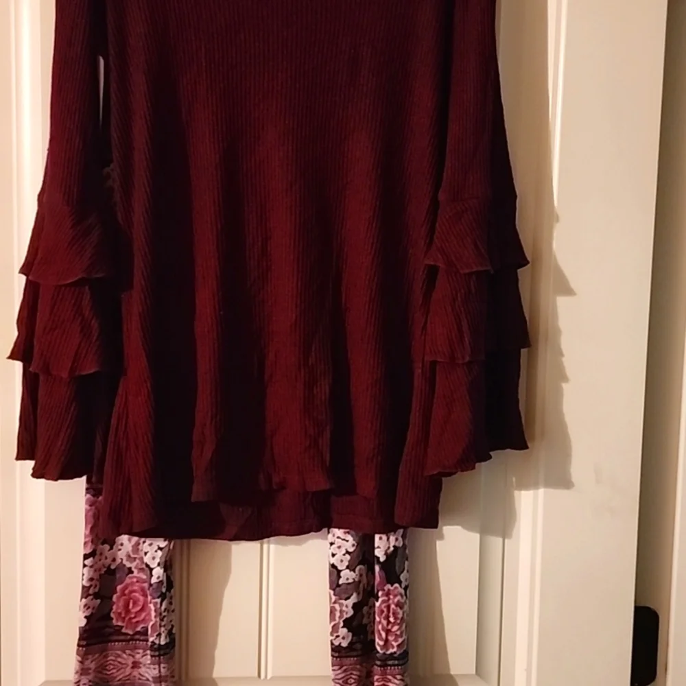 Burgundy bell sleve sweater with multicolored flower tights