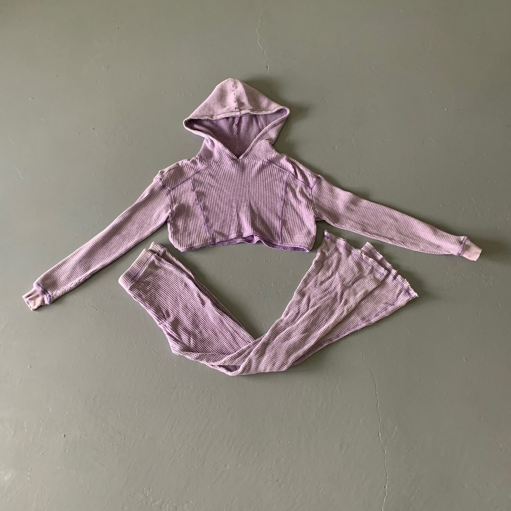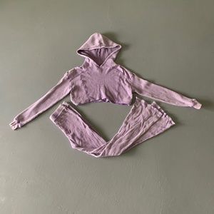 Purple matching set. Waffle texture. Cropped sweatshirt with flared pants.