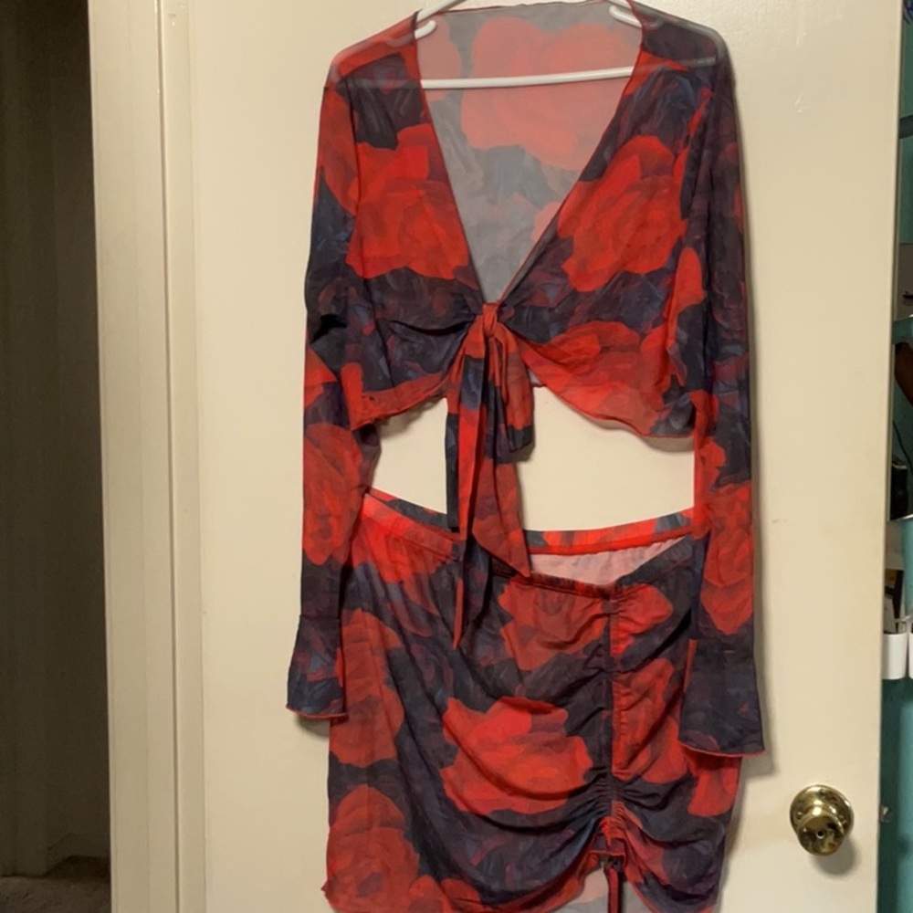 Mesh cover up. So cute and cooling material. It doesn’t fit like a 3XL but the sleeves are long.