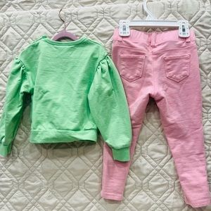 Matching set of textured crew neck and elastic waist pants. Snaps along shoulder for easy dressing