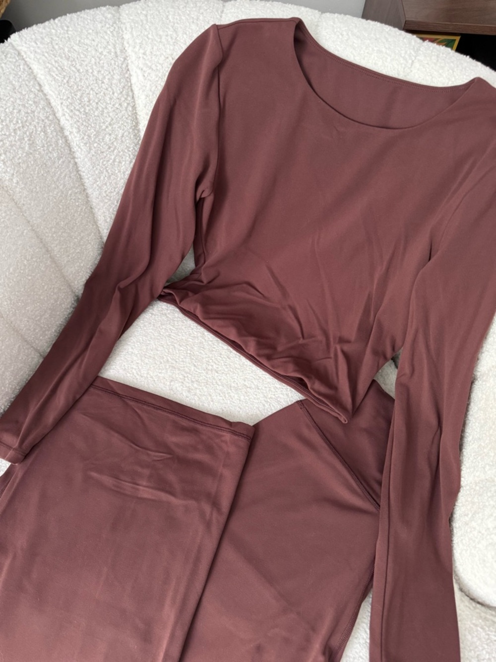 Matching set by Yogalicious: High-waisted brown leggings with pockets & cropped brown long sleeve top #activewear #leggings #gym #yogalicious #luludupe