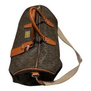 Large brown signature Michael Kors overnight weekend duffle bag with handles and removable shoulder strap. 2 zipper pockets inside as well as 2 other open pockets. It also has a detachable ID tag. Also come with a match Briwn signature Michael Kors purse crossbody a little bit of wear on the purse but this set is perfect for travel.