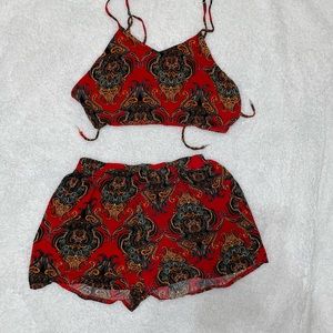 Matching red short set The top is a tie top There is a small hole in the shorts on the crotch, definitely unnoticeable