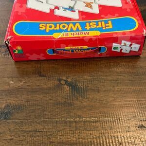This match first words game is in use condition. The box is taped together and some of the cards have a little spots on them. I tried to picture the spots. This game still has lots of life left in it.