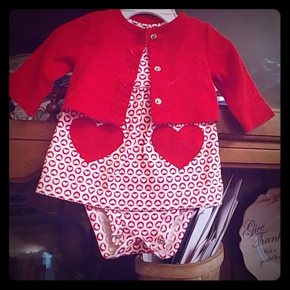 Dress is white with red hearts and has applique red hearts, matching red jacket. Super cute!