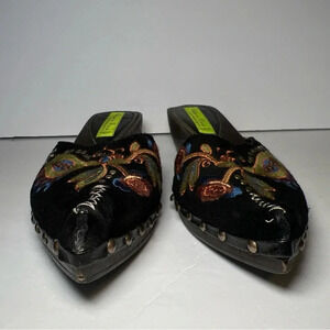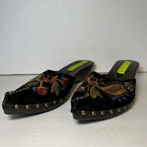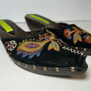 Slip on mule. Suede embroidered top. Pointed toe. Studded along side.