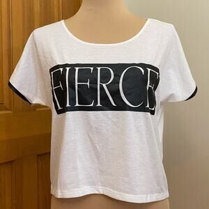 Material Girl Active Semi-Cropped Fierce T-Shirt Size XS; color black and white, materials polyester and spandex. Approximate measurements pit to pit- 21 inches x shoulder to bottom hem- 19 inches. Good condition, see photos.