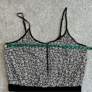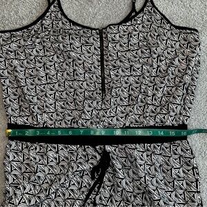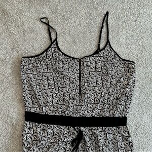 Stylish jumpsuit with geometric pattern. Features spaghetti straps and a fitted waist. Perfect for casual outings.