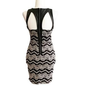 Super cute party dress with faux leather and lace! Cut outs for a sexy yet edgy look. Great stretch.