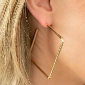A deceptively simple square frame is tilted on point to create a geometric hoop. Its sharp angles are complemented by its rich gold finish, making a lasting impression. Earring attaches to a standard post fitting. Hoop measures approximately 2" in diameter.