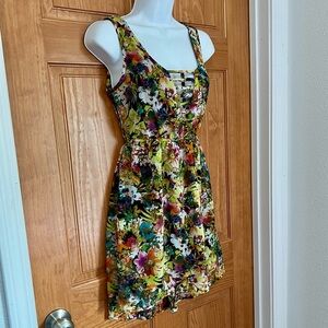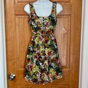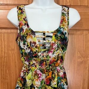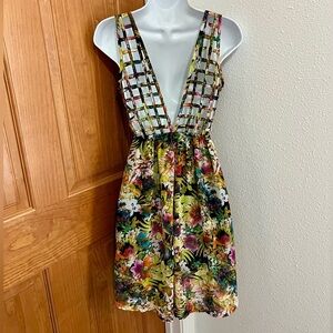 Bold floral mini dress with strappy neckline and open back. Ideal for vibrant summer style. Slightly longer length in back. Sheer with black lining underneath. 100% polyester. In good used condition.