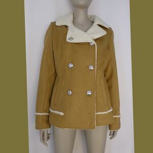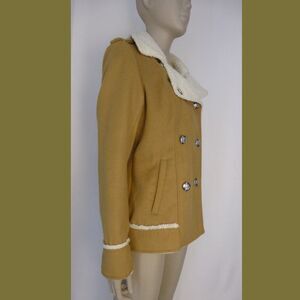 Description: Pre-Owned and still in good condition. Suede-like exterior. Faux Fur Trim. Polyester Lining. Double Breasted. Epaulette Design (military) shoulders. Pockets. Zipper at wrists.