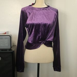 This is a purple long sleeved velvet/velour crop top with a twist knot at the bottom. by Material Girl Active