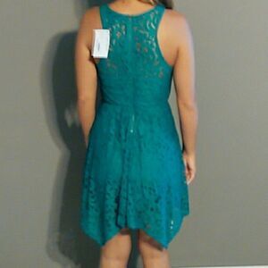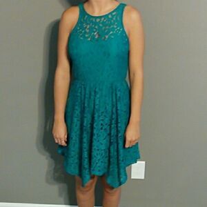 ✨ Material Girl's flirty skater dress with allover lace and racer styling at front and back is party-perfect and ready for a social event.
