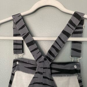 Material Girl black/gray tiger print overalls Jean skirt size medium in excellent condition. Has 2 front pockets. Waist approximately 18” flat.