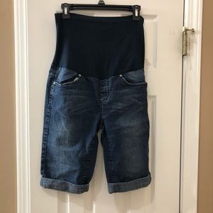 Dark washed jean Bermuda maternity shorts. Blue belly panel. Cuffed at the bottom but can be unrolled. Good condition. 11” inseam when cuffed. Size medium fits like an 8