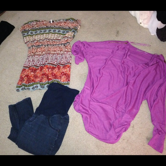 2 medium sized maternity shirts. 1 pair of maternity jeans from motherhood. Super cute outfit. Very comfortable jeans. Spent around 60 dollars on the jeans & 20 on each shirt. Maternity clothes is expensive 😩😩