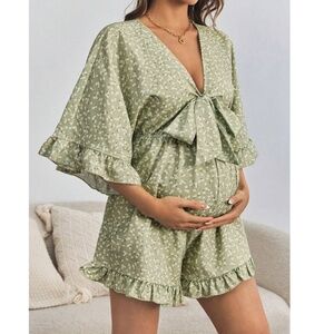 Maternity Floral Print Tie Front Ruffle Hem Short Sleeve Romper