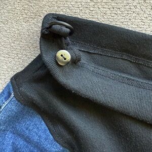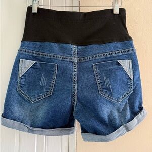Stylish maternity denim shorts featuring a black belly waistband. Perfect for casual outings.