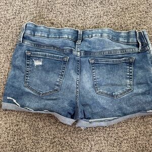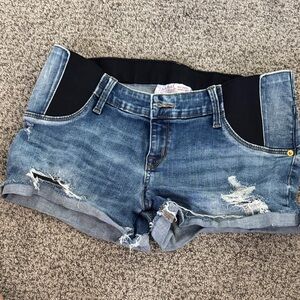 Stylish blue maternity jean shorts with distressed details. Comfortable elastic waistband. Size 8/29.