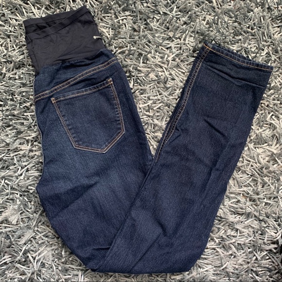 Dark wash maternity jeans. They say skinny but they fit me more like straight leg. I would cuff them up as capris and they were so cute! There is no size listed but they fit S/M