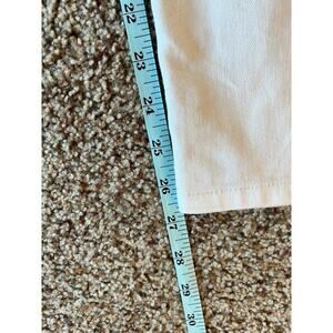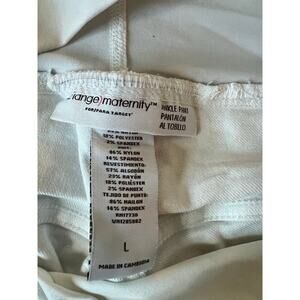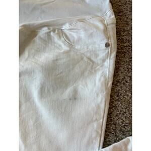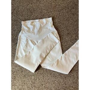 Bright white maternity jeans, 26.5" inseam. Tiny grey markings on left leg by pocket, pictured (have not been treated, maybe they'll come out?). Skinny jean.