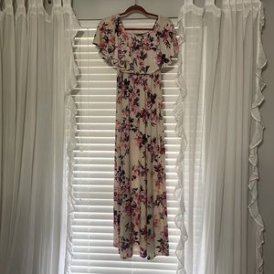 Maternity off the shoulder maxi dress. Material is super stretchy which makes this dress breathable and comfortable. I don’t know if this is supposed to be a maternity dress but I have this and another in blue that I wore for both of my pregnancies. Can also be worn when not pregnant. In perfect condition. No rips, snags, or stains. Smoke free home.