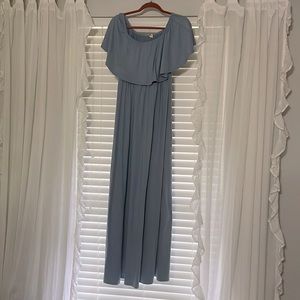 Maternity off the shoulder maxi dress. Material is super stretchy which makes this dress breathable and comfortable. I don’t know if this is supposed to be a maternity dress but I have this and another in a floral print that I wore for both of my pregnancies. I have added a picture of the floral dress on for reference. Can also be worn when not pregnant. In perfect condition. No rips, snags, or stains. Smoke free home.