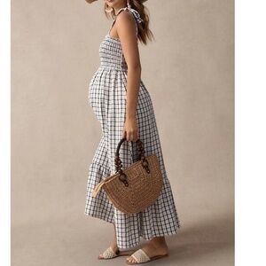 Maternity Plaid Print Shoulder tie Smocked Maxi Dress