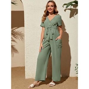 Maternity Pocket Side Roll Up Sleeve Belted Jumpsuit green