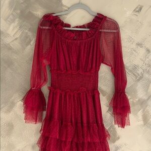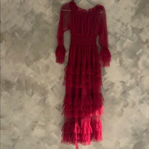 Step out in style with this maternity red ruffled dress. Perfect for any occasion, this dress features a flattering silhouette and eye-catching ruffles. A must-have addition to your wardrobe. Worn once for photoshoot.