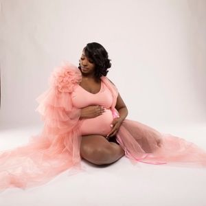Pink one shoulder maternity robe for pictures worn once. It’s very long & very beautiful! I’ve listed a picture of what it looks like before I brought it & what it looked like on me.