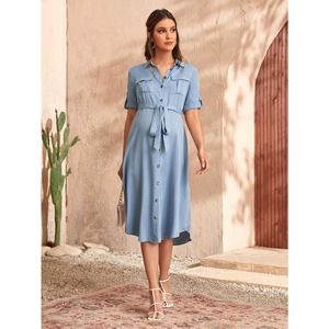 Maternity Roll Tab Sleeve Flap Pocket Belted button down shirt Dress light blue