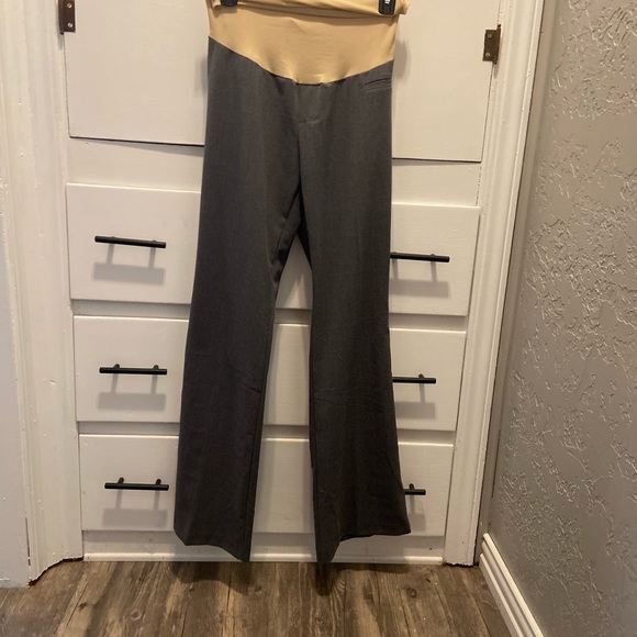 Motherhood gray maternity slacks that are very long in length and very soft material.