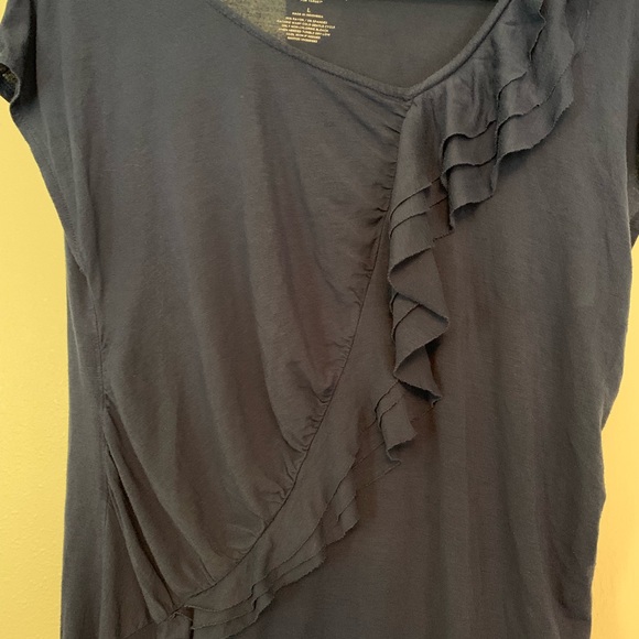 Navy blue with adorable diagonal ruffle detail. Banded at bottom.