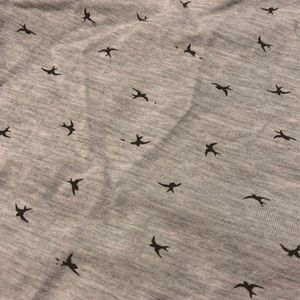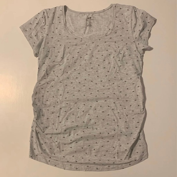 Light grey maternity tee with small bird pattern. Has ruched sides.