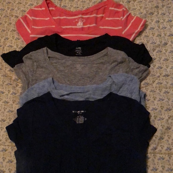 5 maternity short sleeve t-shirts. Navy blue, light blue, gray, black and pink with white strips. Brands are Old Navy, a:glow, Liz Lange maternity for target. There is also one Old navy black tank top.