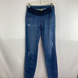 This is a gently used condition pair of maternity jeans. The stretchy fabric in the front is comfy during pregnancy and post partum when you are still needing extra room. Inseam is 27.5 inches
