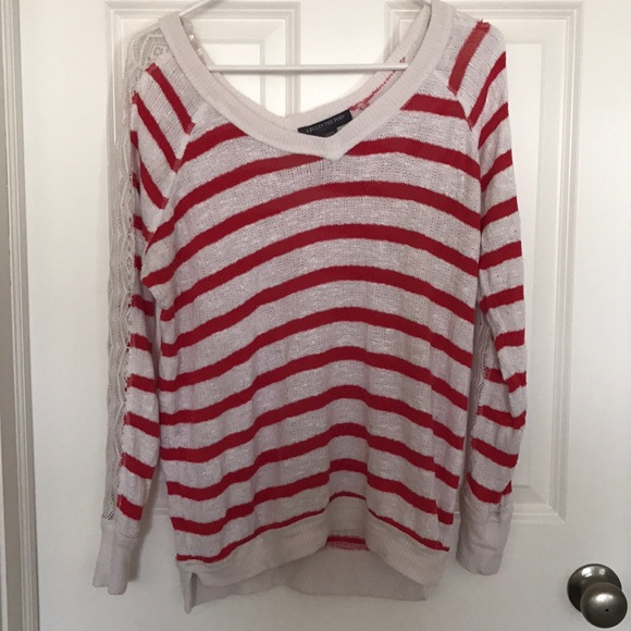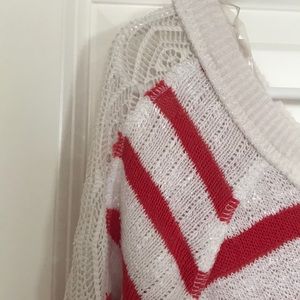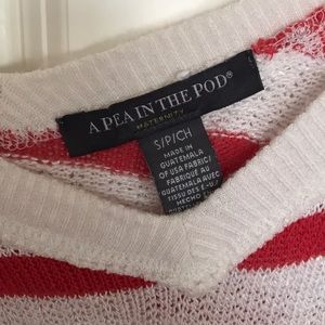 Red and white striped maternity sweater with lace down the sleeves.